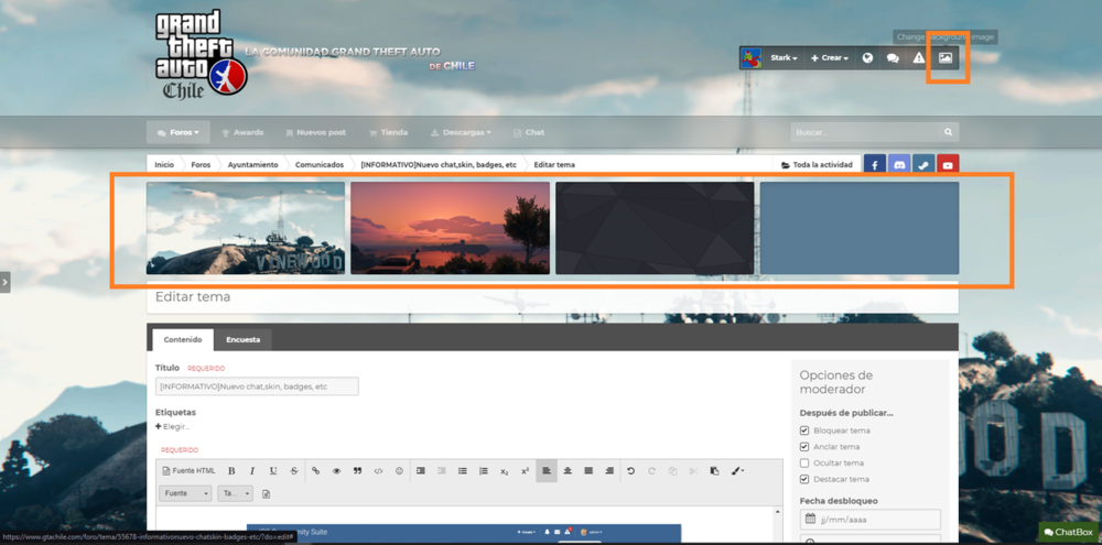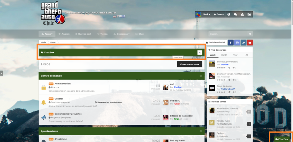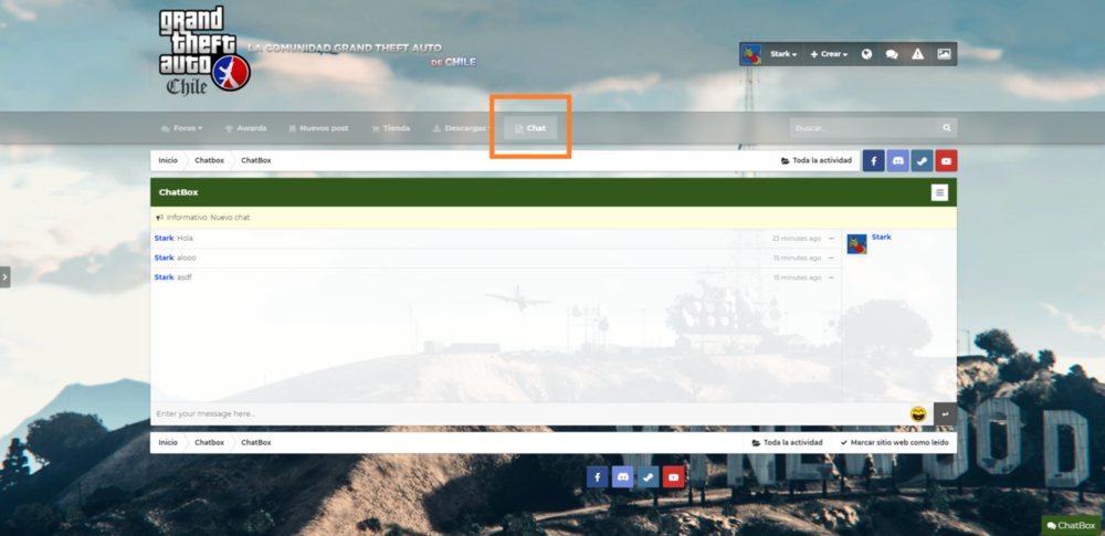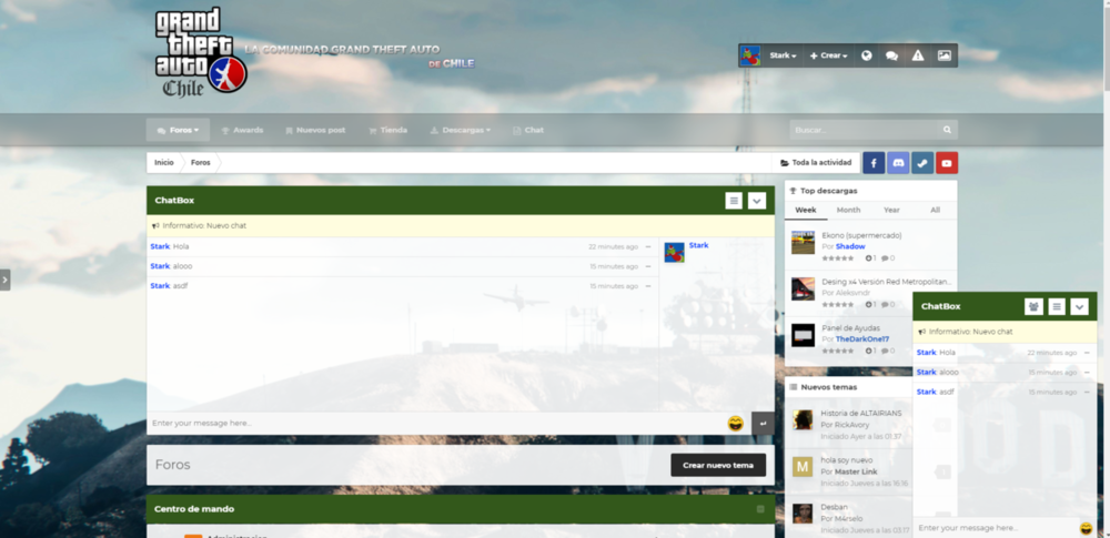 Estimados, Hoy vengo a informarles sobre el nuevo sistema de chat que se estara integrando al foro, que permitira chats privados, salas de chats, incluso, podran chatear desde cualquier parte del sitio, en fin muchas nuevas funcionalidades ? Detalles de la aplicacion: Los cuadros de chat que se muestran en la parte inferior derecha permiten a los miembros chatear entre ellos. Multi chat al mismo tiempo. Permiso para quién puede usar el chat privado. Posibilidad de seleccionar piel para cada cuadro. Cargue más mensajes al desplazarse hacia arriba (o hacia abajo). Fácil de encontrar el nombre del miembro para iniciar el chat. Notificación sonora para nuevo mensaje. Minimizar y cerrar cuadros de chat. Admite entrada de texto limpia con emoji, Youtube, URL, URL de imagen. Admite imágenes de Lazyload y musica en el chat. Control de inundaciones. Límite de longitud del mensaje. Permiso para editar / eliminar mensajes. Totalmente responsive: se adaptará a dispositivos móviles, tabletas y desktop. (Tarea: ignorar miembro, nuevo estilo de conversación, herramienta para eliminar todas las conversaciones, invitar a miembros a una conversación ...) Imagenes DEMO Tambien se estara retrabajando en este nuevo skin, en el cual podras modificar los colores y el background del sitio, para mas comodidad y diversidad ? Si quieres ayudarnos a encontrar un buen fondo para nuestro foro, ayudanos aqui! CLICK AQUI Y sin ser lo ultimo en mejoras, tambien estare trabajando en nuevos badges para los usuarios, admins, staff, etc. Tambien les dejo el topic para que me puedan ayudar ? CLICK AQUI Atte. GTAChile