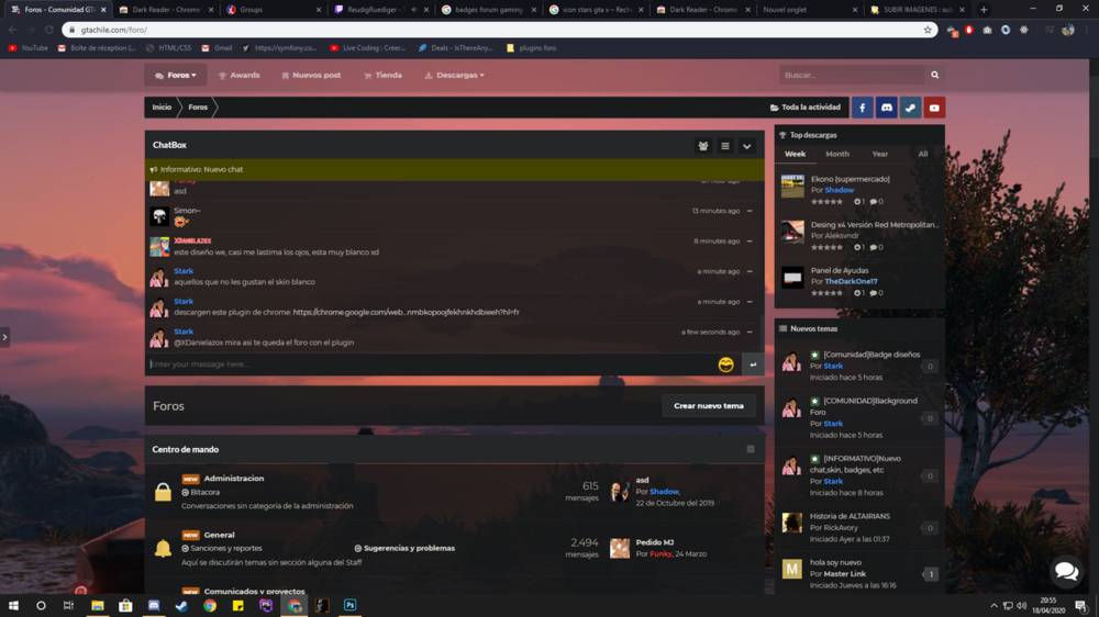 Los que quieran tener un skin mas oscuro, les invito a descargar la extension de chrome llamada darkreader https://chrome.google.com/webstore/detail/dark-reader/eimadpbcbfnmbkopoojfekhnkhdbieeh?hl=fr Despues de instalarla, activen el modo dark y el foro os quedar asi: ?